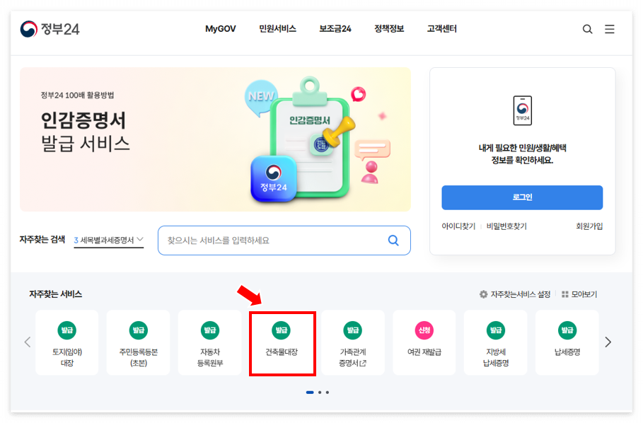 - 상단 검색창에 "건축물대장 발급" 입력 후 검색